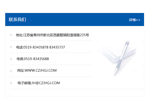 地址:常州市新北區友邦商務大廈1幢16、17層  電話:0519-85101652  傳真:0519-85112595  郵編:213022  網址:www_cz-jiayue_cn.shworldcot.com  郵箱:xiajifengaa@163.com
